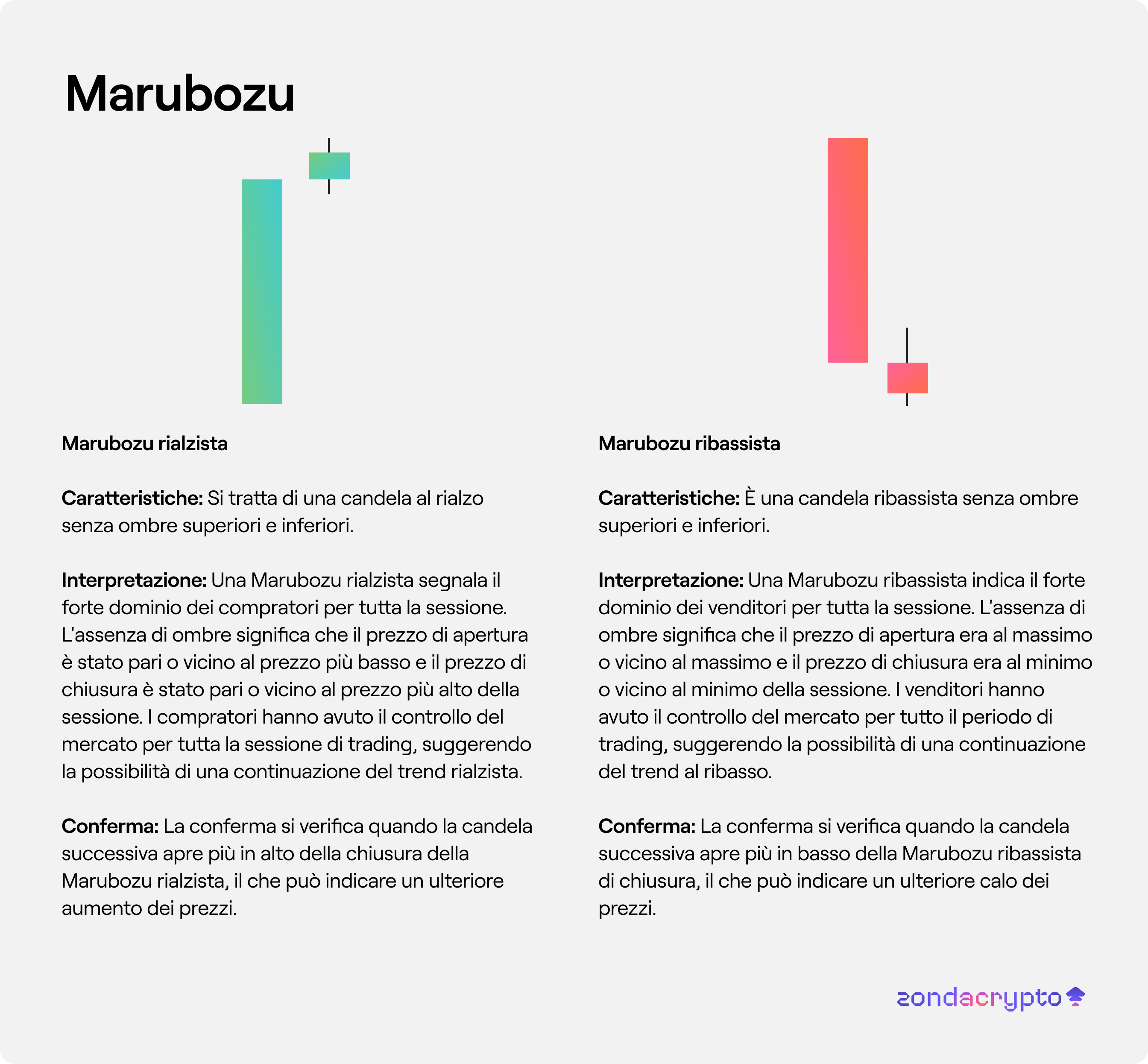 Conferma: La conferma si verifica quando la candela successiva apre più in alto della chiusura della Marubozu rialzista, il che può indicare un ulteriore aumento dei prezzi.