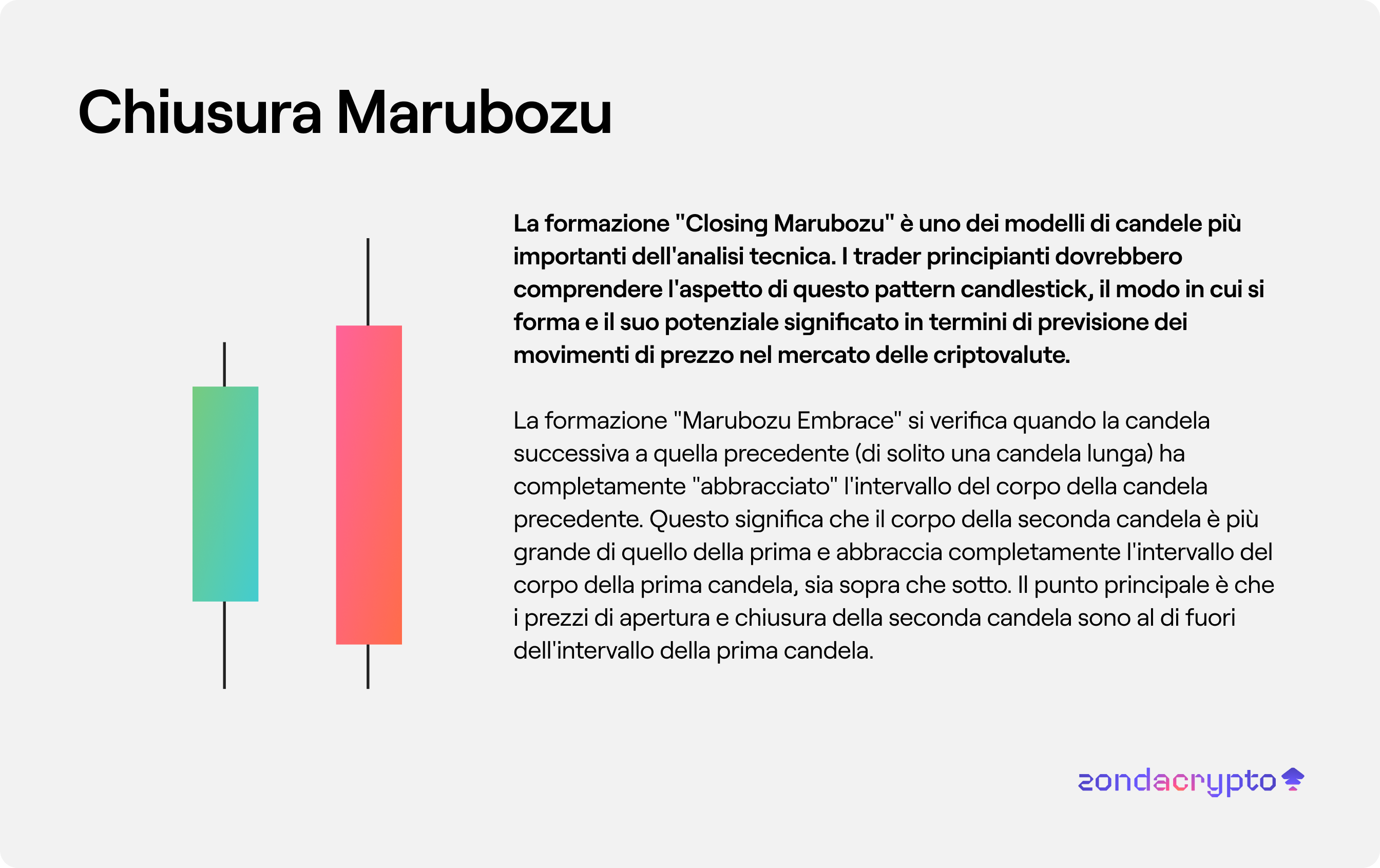 La formazione "Closing Marubozu" è uno dei modelli di candele più importanti dell'analisi tecnica. I trader principianti dovrebbero comprendere l'aspetto di questo pattern candlestick, il modo in cui si forma e il suo potenziale significato in termini di previsione dei movimenti di prezzo nel mercato delle criptovalute.