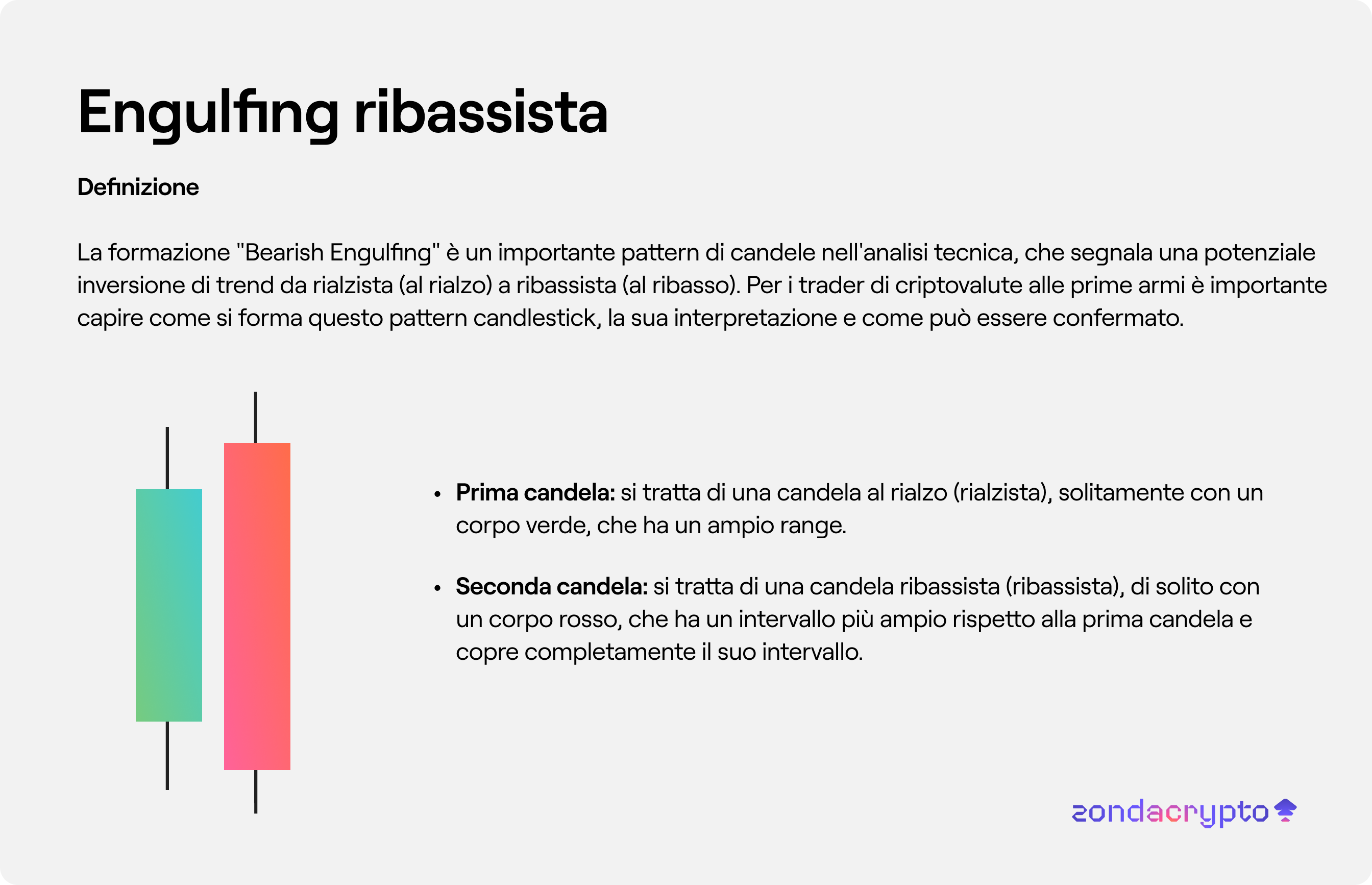 La formazione "Bearish Engulfing" è un importante pattern di candele nell'analisi tecnica, che segnala una potenziale inversione di trend da rialzista (al rialzo) a ribassista (al ribasso). Per i trader di criptovalute alle prime armi è importante capire come si forma questo pattern candlestick, la sua interpretazione e come può essere confermato.