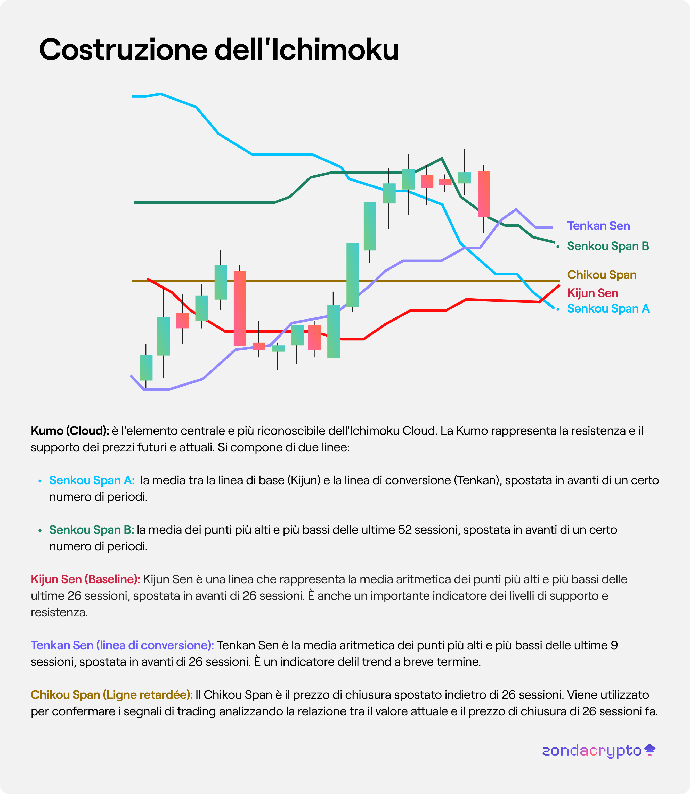 L'Ichimoku è composto da diversi elementi che insieme formano un sistema completo di analisi tecnica: