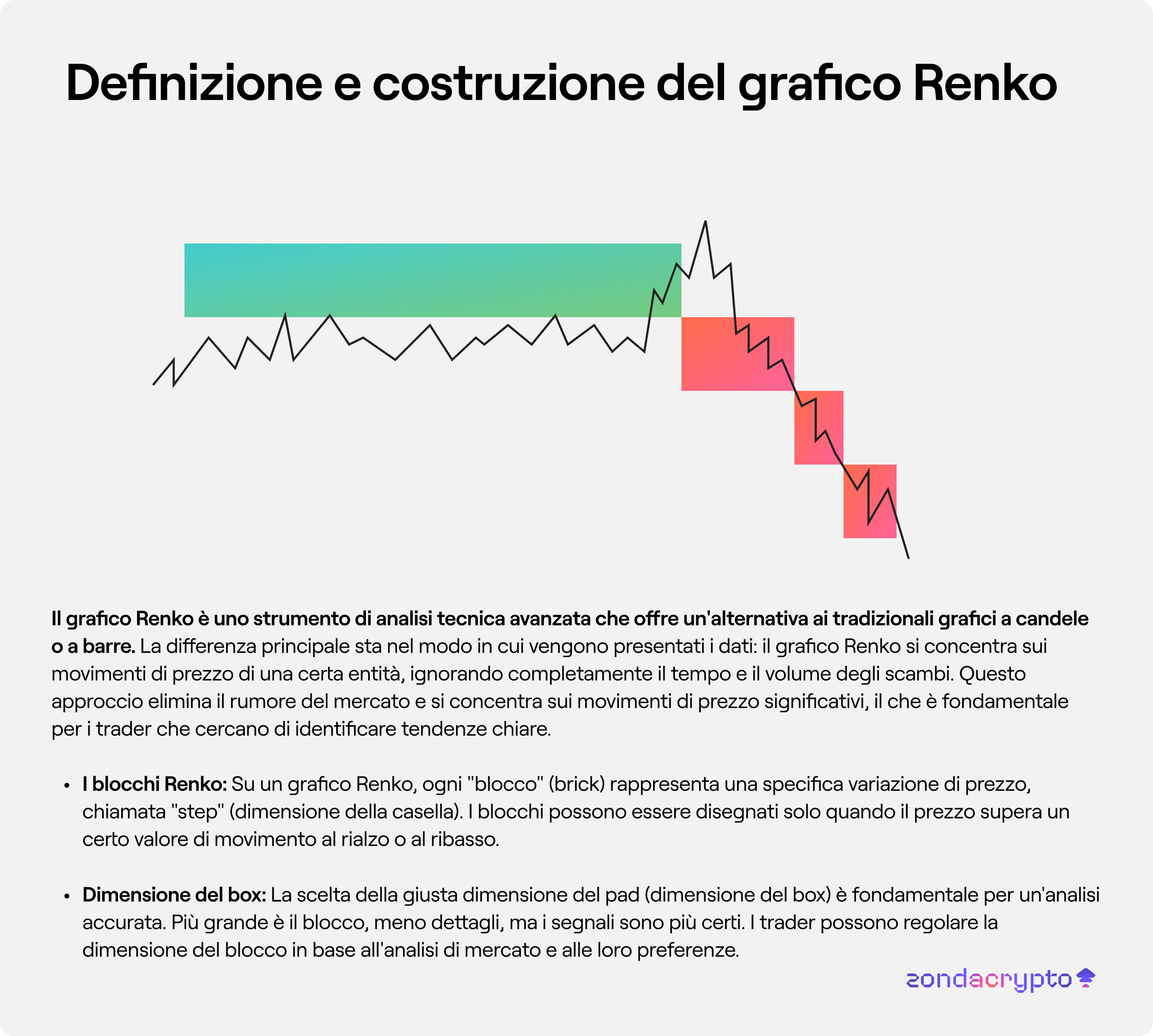 I blocchi Renko: Su un grafico Renko, ogni "blocco" (brick) rappresenta una specifica variazione di prezzo, chiamata "step" (dimensione della casella). I blocchi possono essere disegnati solo quando il prezzo supera un certo valore di movimento al rialzo o al ribasso.