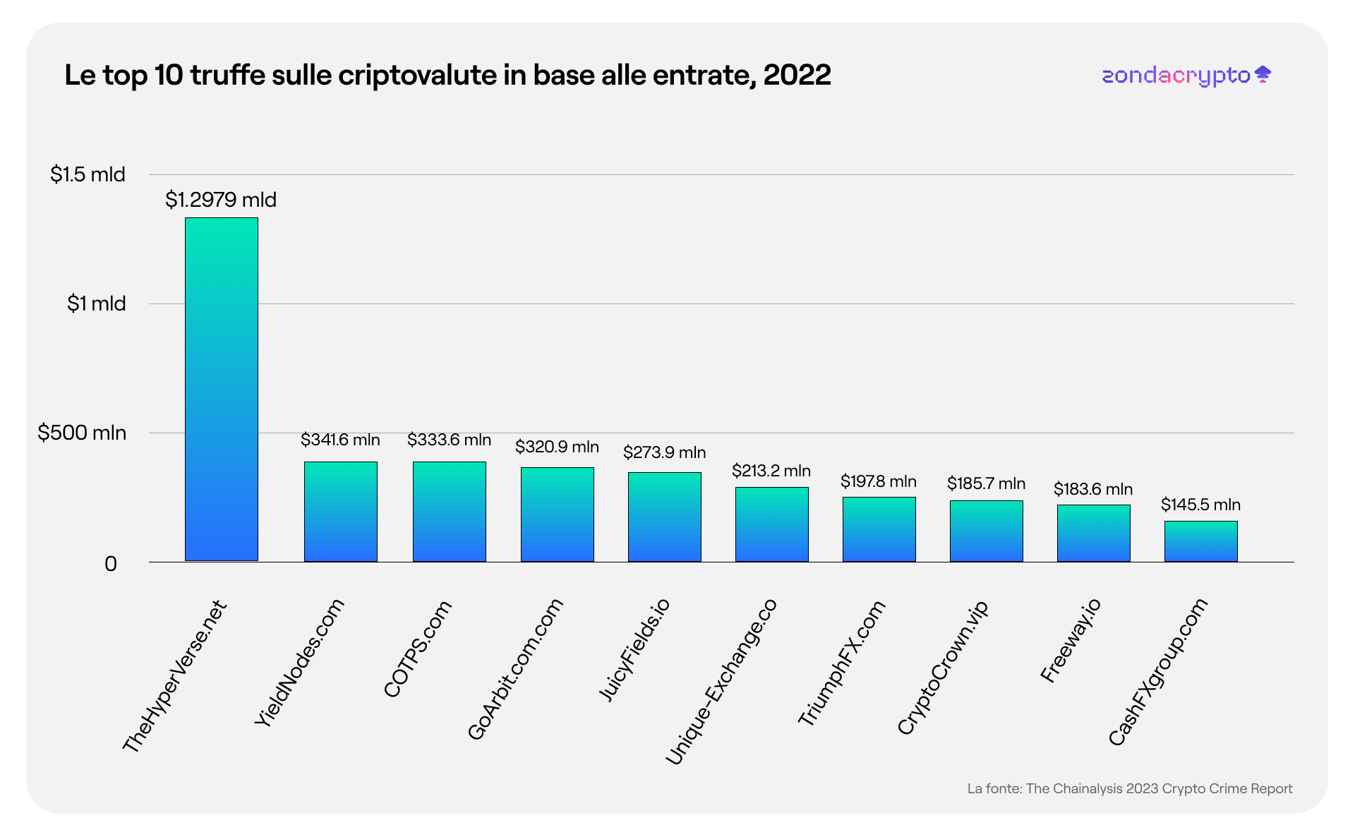Nonostante il fatto che i ricavi di questa categoria siano diminuiti nel 2022, sono state osservate diverse truffe di grande successo. Il più grande di questi è stato Hyperverse, che ha generato entrate per quasi 1,3 miliardi di dollari. Le prime 10 truffe sulle criptovalute nel 2022 erano tutte truffe sugli investimenti: