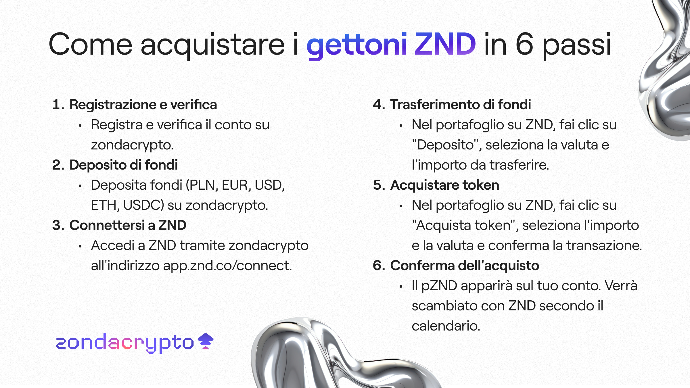 Deposita sul tuo conto zondacrypto i fondi con cui desideri acquistare i token ZND. Ricorda che puoi utilizzare valute come PLN, EUR, USD, ETH o USDC per acquistare i token. Se hai bisogno di aiuto, dai un'occhiata alle istruzioni: https://zondacrypto.com/it/helpdesk/zondacrypto-exchange/payments-and-withdrawals