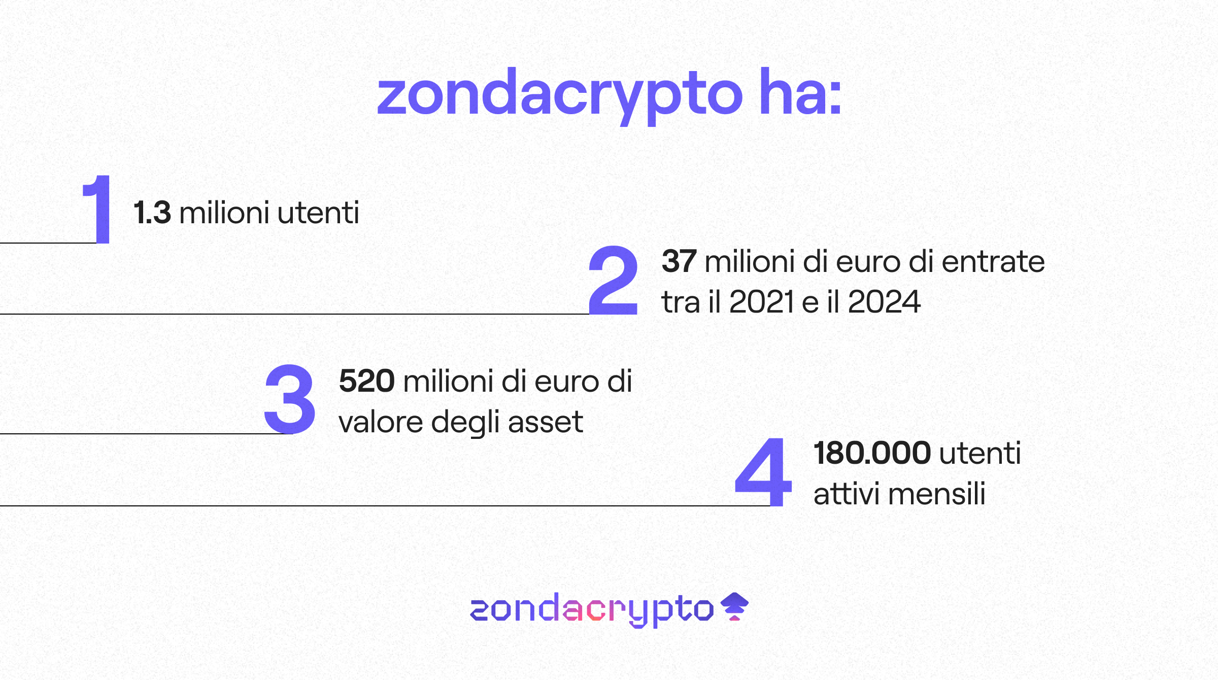Per capire come il token ZND completa il nostro ecosistema, vorremmo iniziare ricordando quali sono gli elementi che lo compongono. Il punto centrale è zondacrypto - il più grande exchange dell'Europa centrale e orientale, che fornisce una piattaforma sicura e completamente regolamentata per lo scambio di asset sia in versione desktop che mobile. I suoi prodotti sono utilizzati da 1,3 milioni di utenti, le cui operazioni hanno generato entrate per 37 milioni di euro tra il 2021 e il 2024. La piattaforma dispone di asset per un valore di 520 milioni di euro. Il numero mensile di utenti attivi è di 180.000.