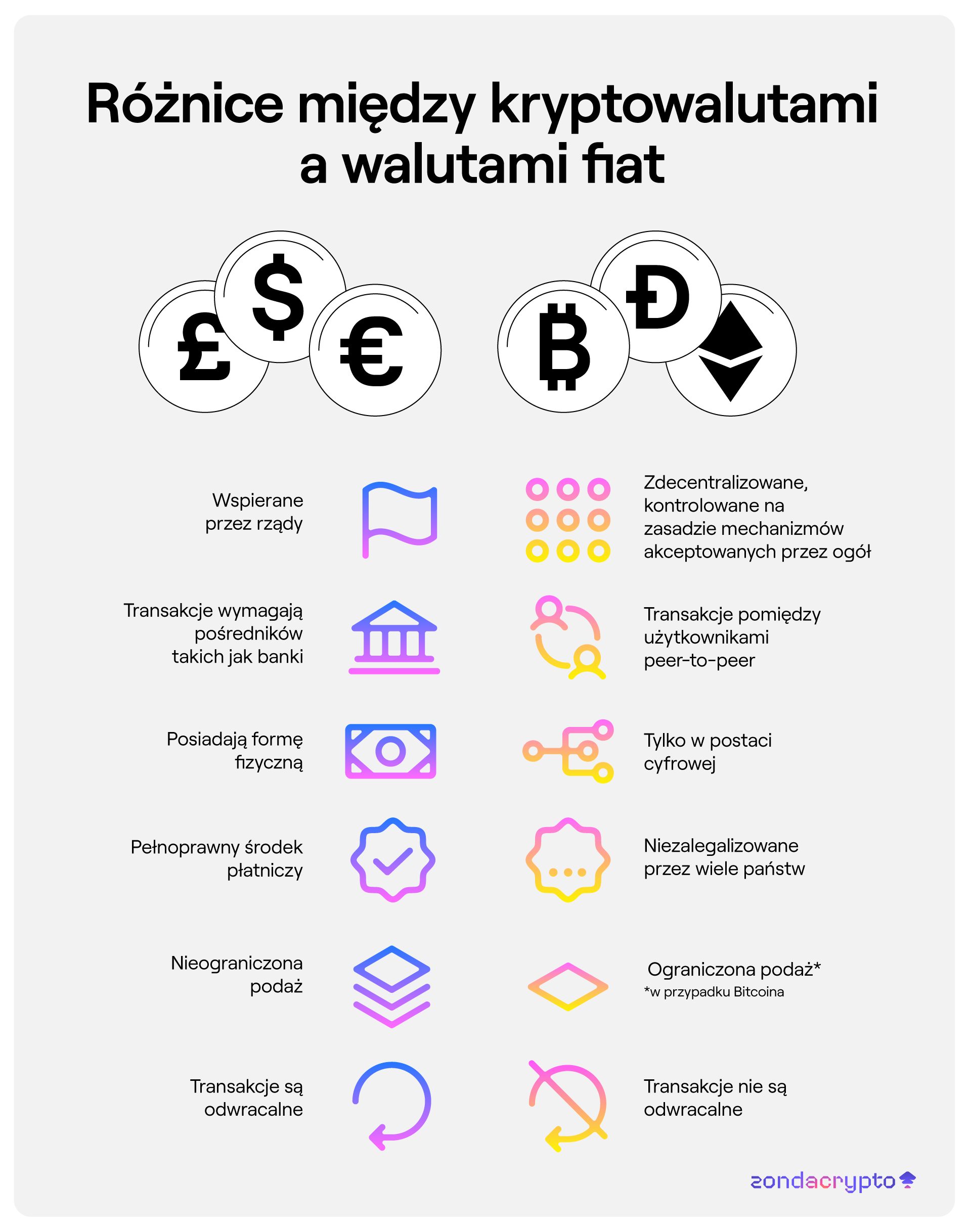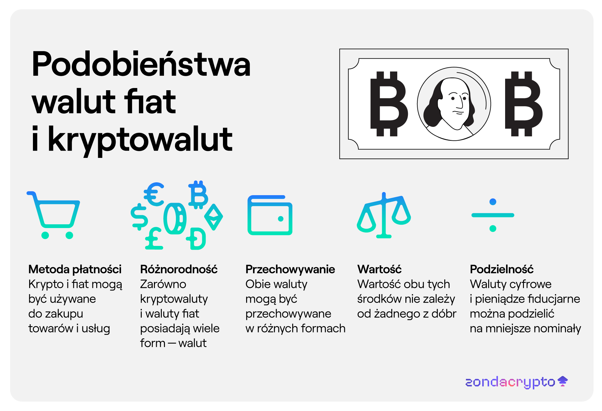 Jeśli zapytasz „Czy kryptowaluty i pieniądze fiat są tym samym?” – możesz otrzymać dwie, równie dobre odpowiedzi: tak i nie. Przyjrzyj się podobieństwom i różnicom wymienionym poniżej.