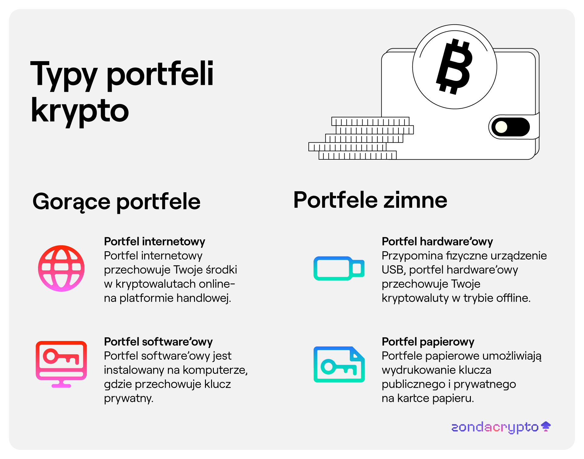 Portfele software’owe to zazwyczaj portfele gorące, ponieważ do działania wymagają Internetu. Portfele hardwarowe i papierowe to portfele zimne.