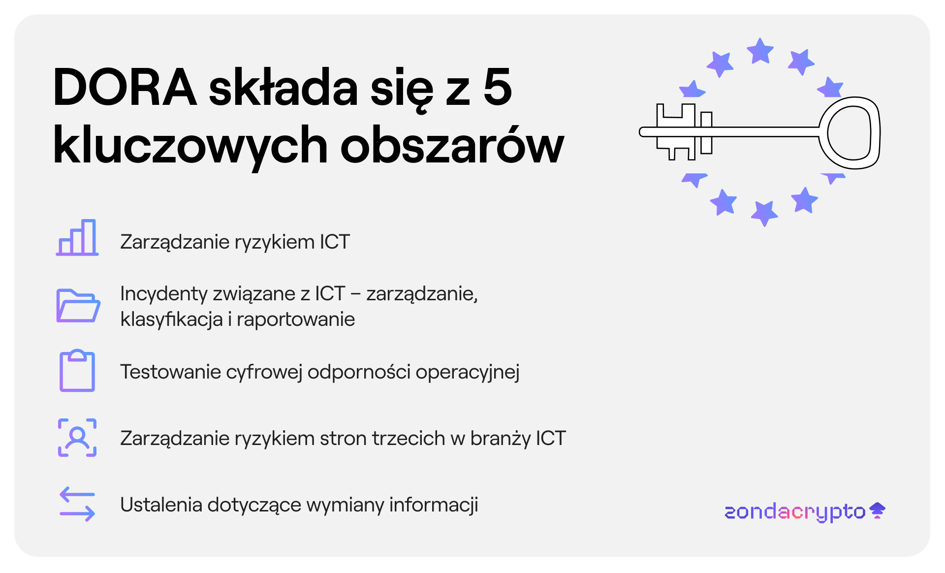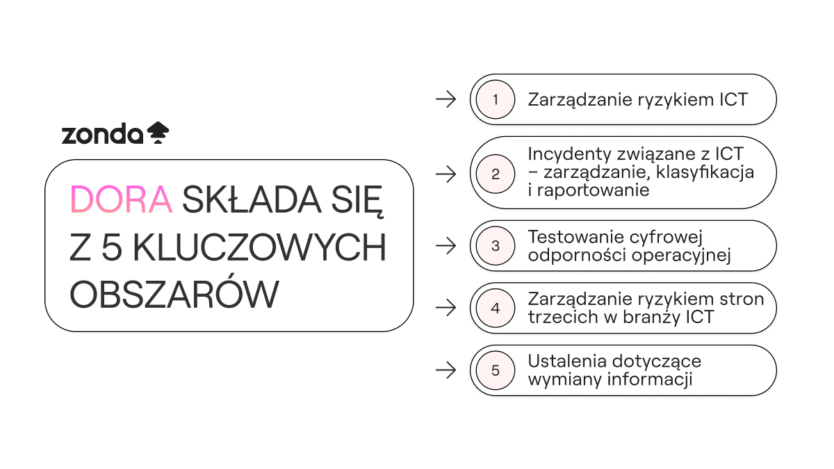 W ramach każdego z kluczowych obszarów, DORA wymaga od podmiotów finansowych spełnienia szeregu wymogów w odniesieniu do różnych aspektów w ramach ICT i bezpieczeństwa cyfrowego. W ten sposób wytycza kompleksowe* ramy dla cyfrowej odporności podmiotów finansowych.