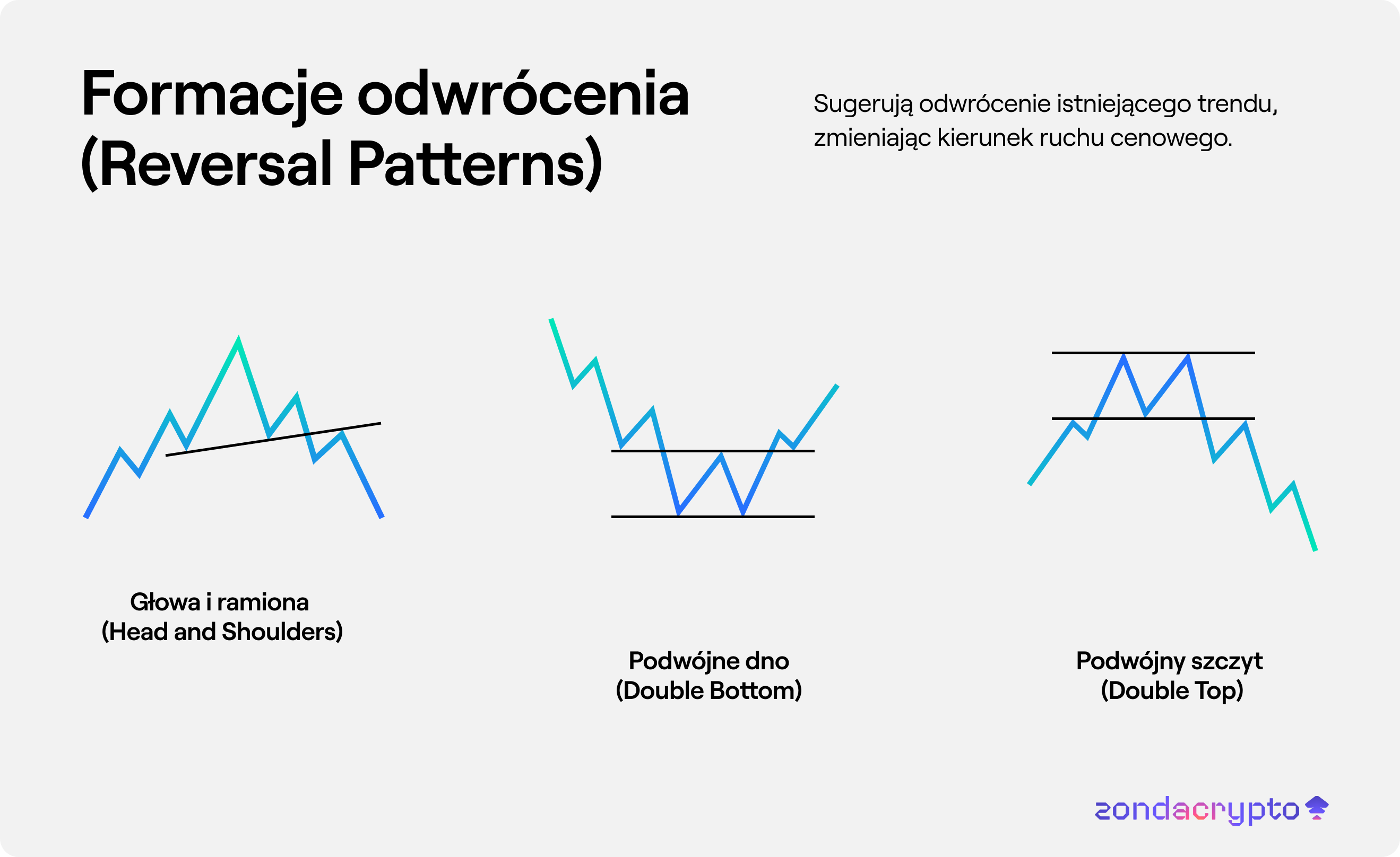 Formacje odwrócenia (Reversal Patterns) – Sugerują odwrócenie istniejącego trendu, zmieniając kierunek ruchu cenowego: