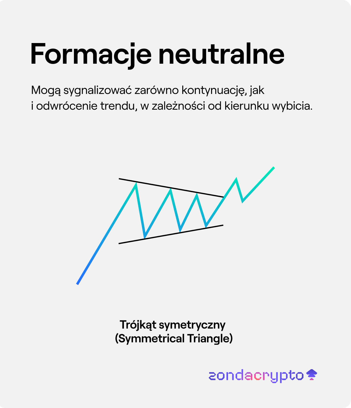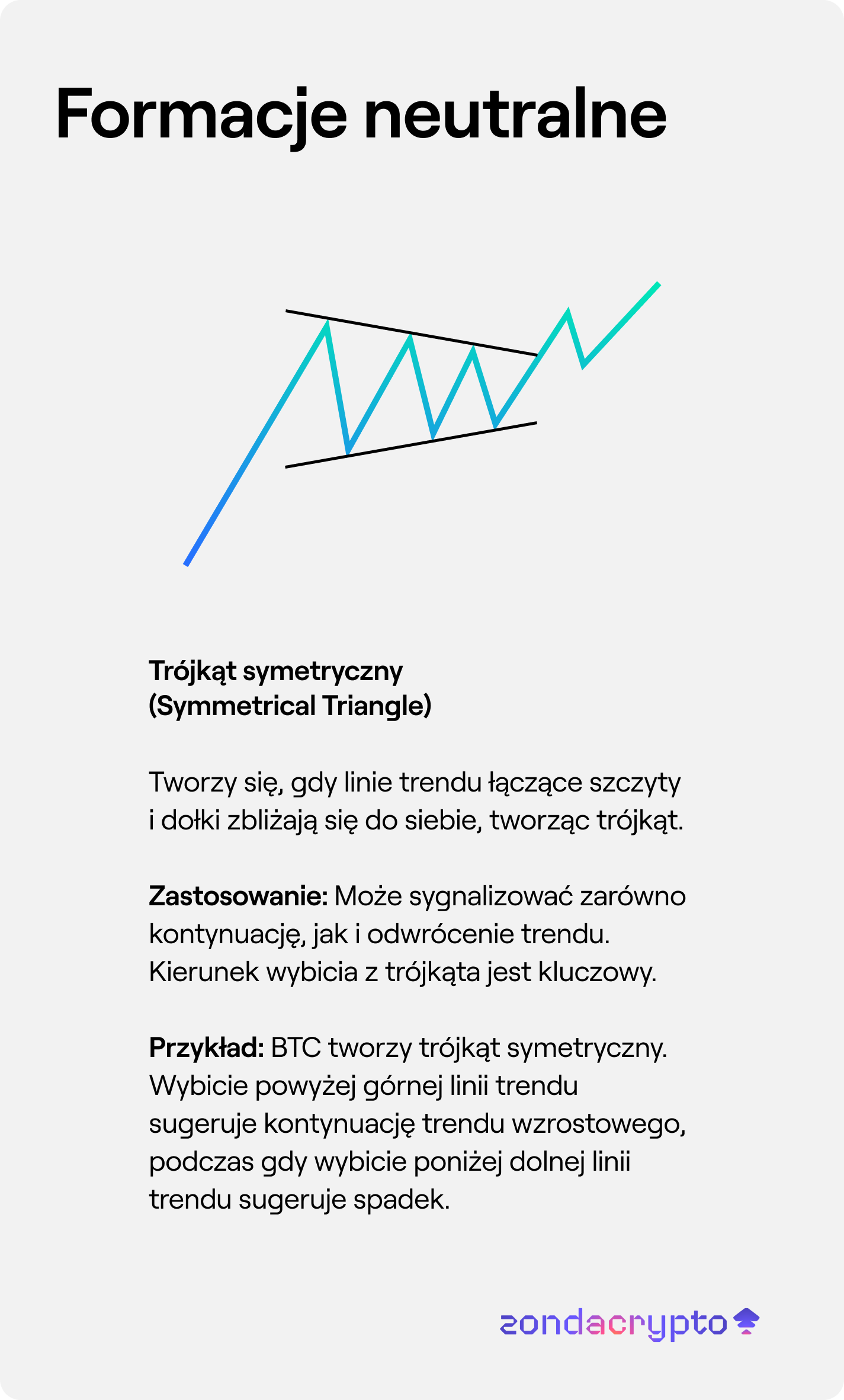 Przykład: BTC tworzy trójkąt symetryczny. Wybicie powyżej górnej linii trendu sugeruje kontynuację trendu wzrostowego, podczas gdy wybicie poniżej dolnej linii trendu sugeruje spadek.