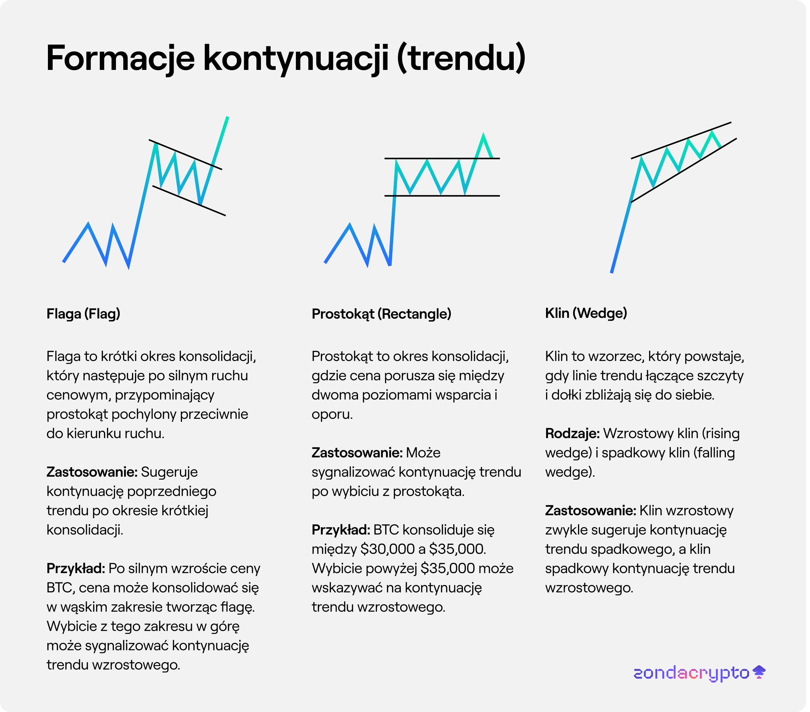 Przykład: BTC konsoliduje się między $30,000 a $35,000. Wybicie powyżej $35,000 może wskazywać na kontynuację trendu wzrostowego.