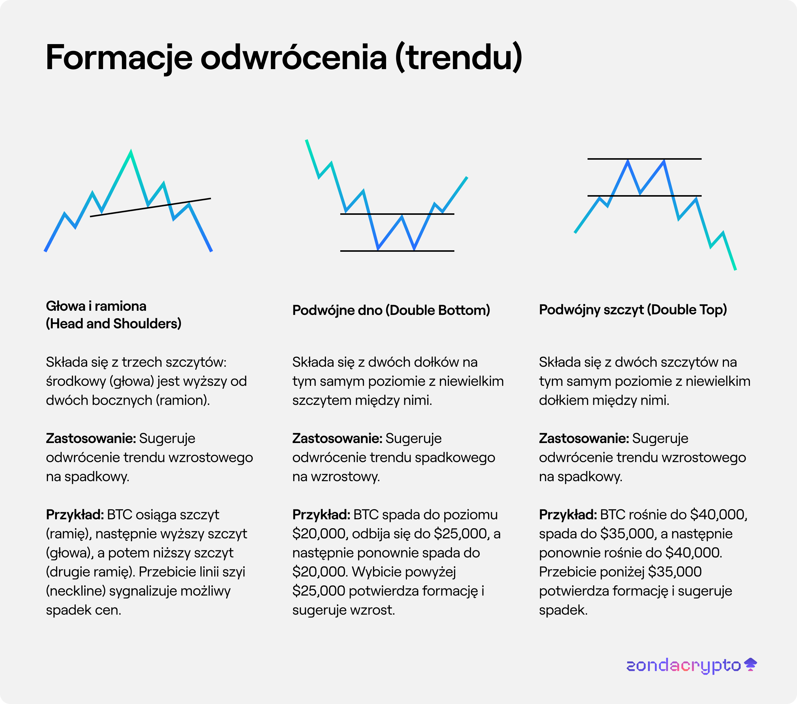 Przykład: BTC rośnie do $40,000, spada do $35,000, a następnie ponownie rośnie do $40,000. Przebicie poniżej $35,000 potwierdza formację i sugeruje spadek.