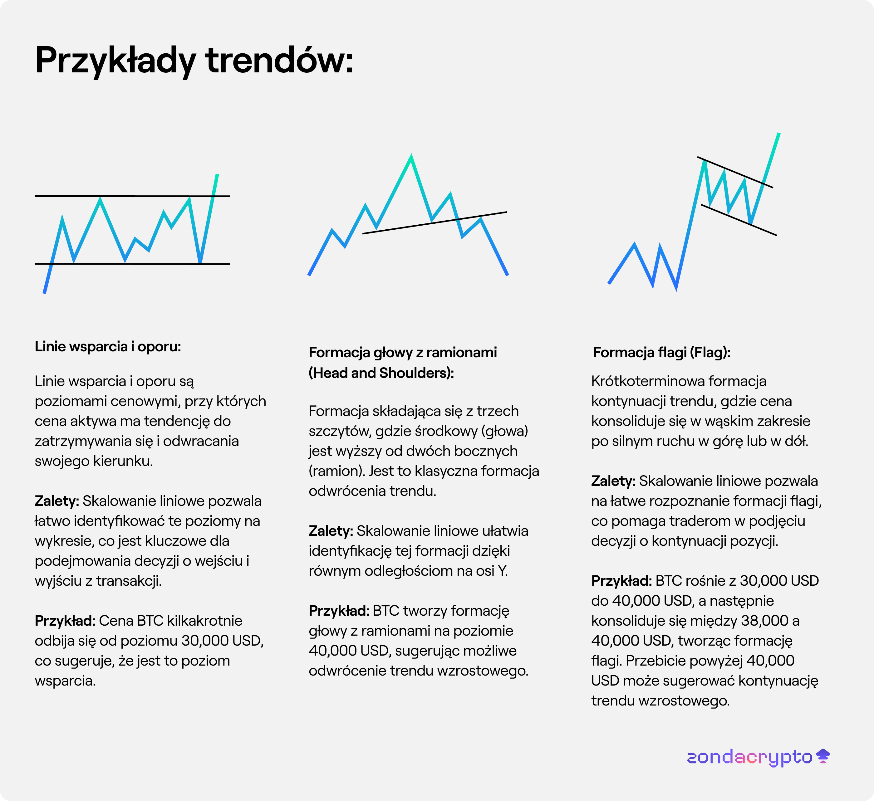 Zalety: Skalowanie liniowe pozwala łatwo identyfikować te poziomy na wykresie, co jest kluczowe dla podejmowania decyzji o wejściu i wyjściu z transakcji.