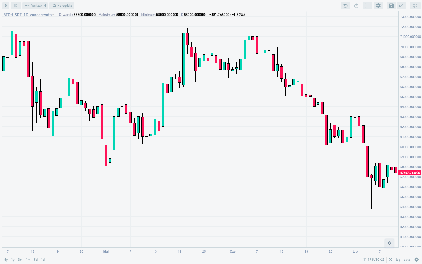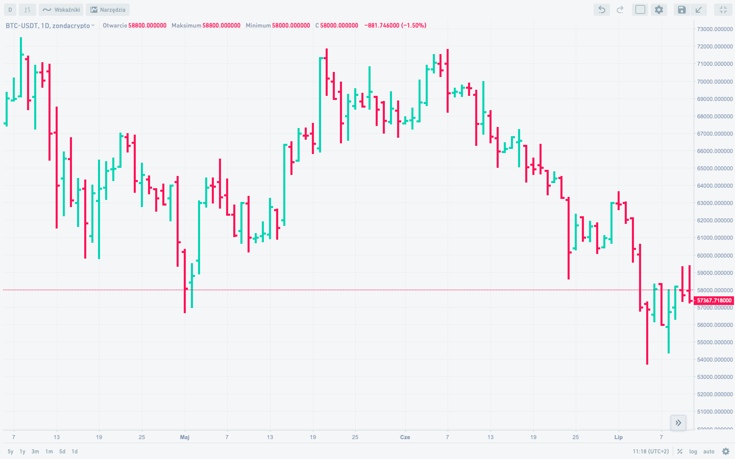 Weźmy jako przykład poniższy wykres. Jest to wykres BTC/USD, gdzie oś pionowa pokazuje wartość wyrażoną w dolarach amerykańskich, którą w danym momencie trzeba zapłacić (oś pozioma) za jednego bitcoina.