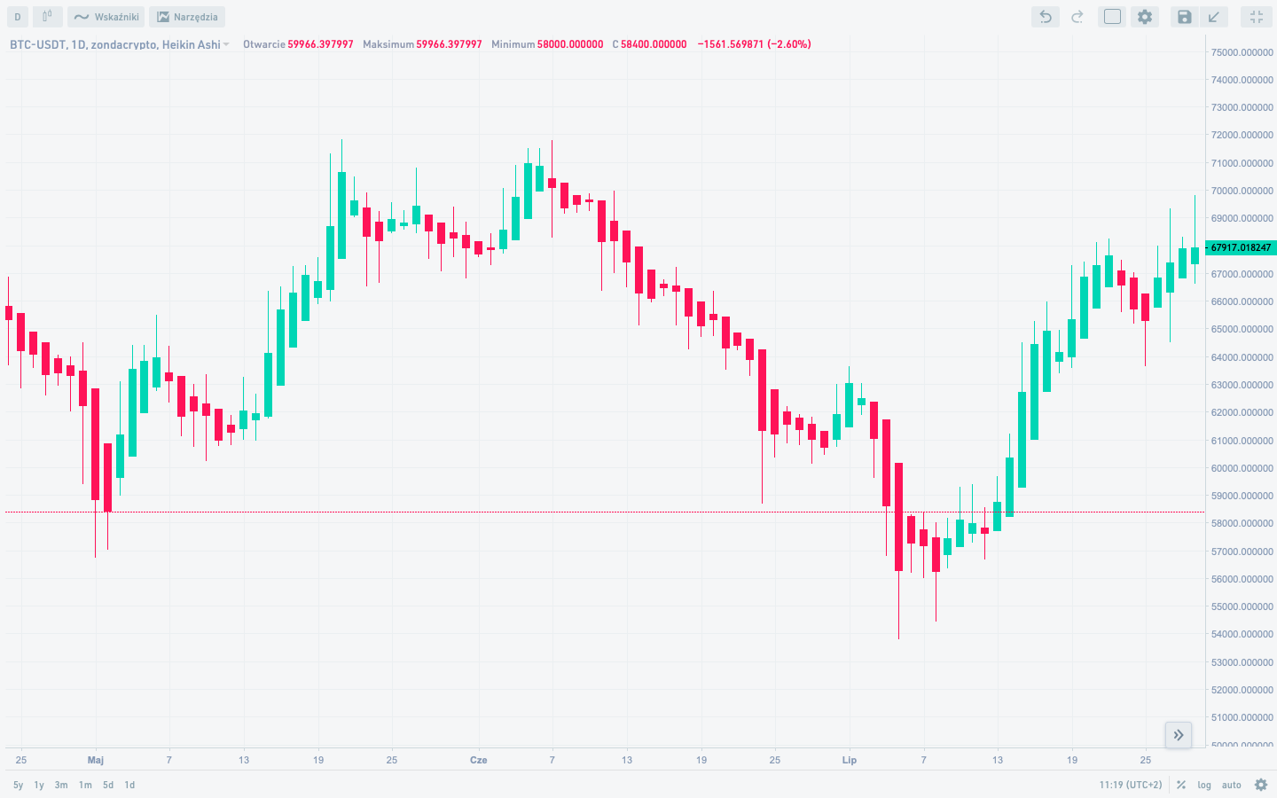 Wykresy Heikin-Ashi to narzędzie analizy technicznej, które pomaga traderom lepiej zrozumieć trendy rynkowe i podejmować bardziej świadome decyzje handlowe. W przeciwieństwie do tradycyjnych wykresów świecowych, wykresy Heikin-Ashi wygładzają ruchy cenowe, co ułatwia identyfikację trendów i eliminację szumów rynkowych. Świece Heikin-Ashi są tworzone na podstawie średnich cen, co sprawia, że są bardziej płynne i mniej podatne na krótkoterminowe wahania. Świece bez dolnych cieni wskazują na silny trend wzrostowy, natomiast świece bez górnych cieni wskazują na silny trend spadkowy. Świece z długimi cieniami po obu stronach i małymi korpusami wskazują na okres konsolidacji lub potencjalne odwrócenie trendu.