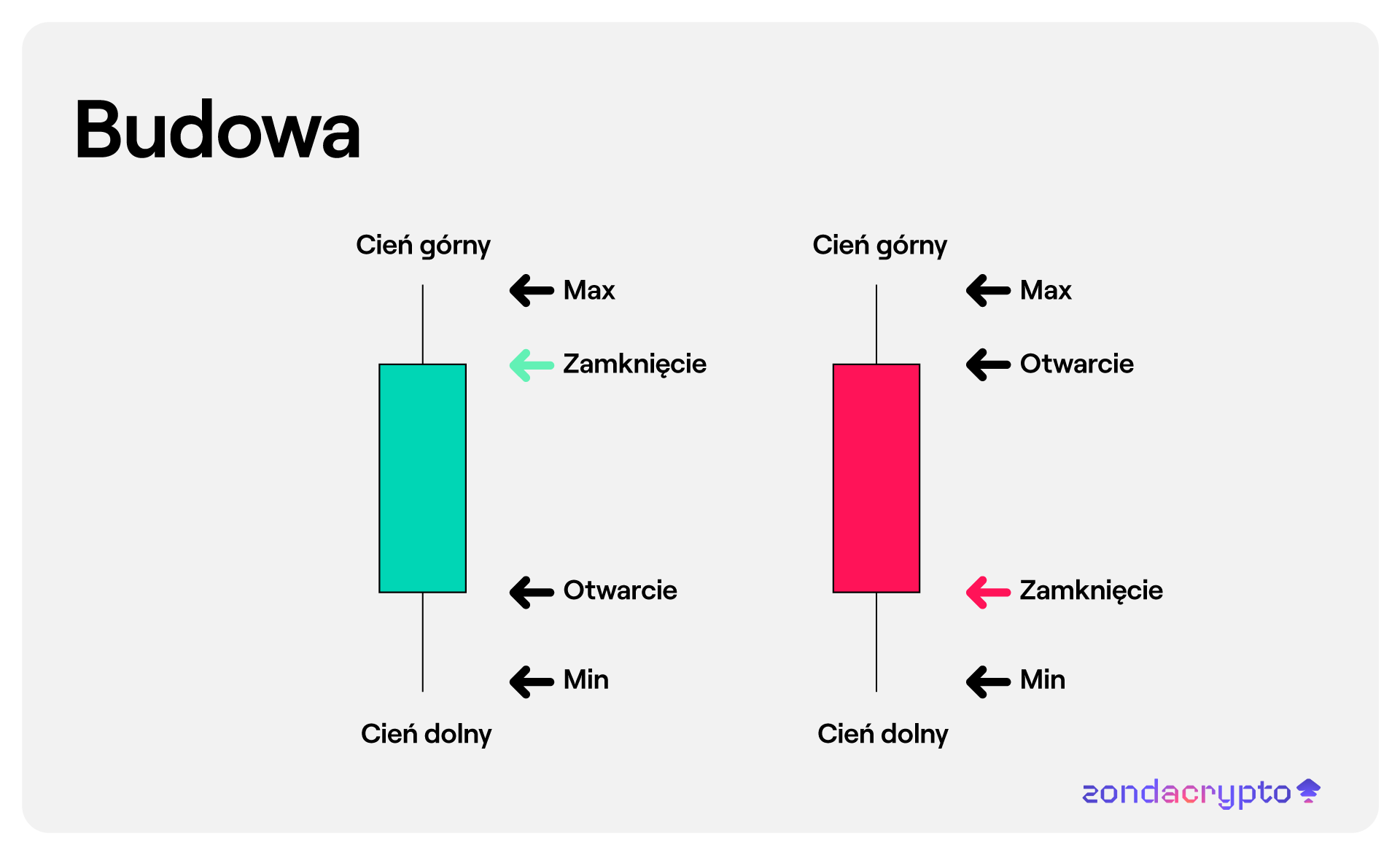 Jeśli cena wzrosła od początku analizowanego okresu, korpus świecy jest zielony z ceną otwarcia na dole i ceną zamknięcia na górze. Analogicznie czerwony kolor świecy mówi nam, że cena spadła od początku analizowanego okresu.