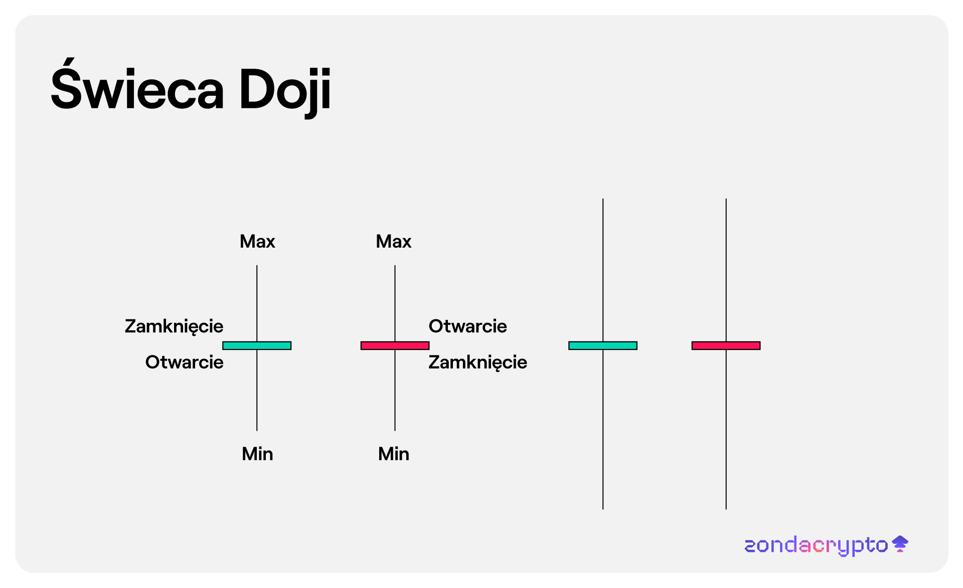 Formacja nazywana jest świecą Doji, gdy ceny otwarcia i zamknięcia są praktycznie takie same. Jak jednak widać na zdjęciu, świece te mogą się od siebie różnić. Długość knota (cień)w różnych sytuacjach może przybierać różne rozmiary.
