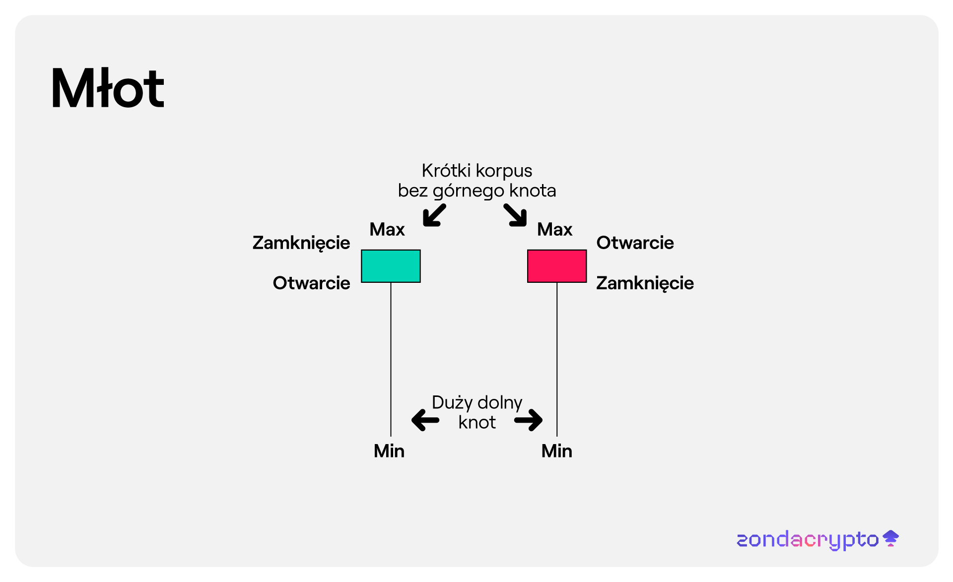 W formacji Młota widzimy mały korpus blisko górnego knota bez dolnego lub z bardzo krótkim knotem dolnym. Formacja ta uważana jest za sygnał wzrostowy w trendzie spadkowym. Wskazuje to nam, kiedy sprzedający mieli kontrolę i w którym momencie utracili ją na rzecz kupujących - w rezultacie cena ponownie wzrosła w okolicach poziomu otwarcia lub wyżej.