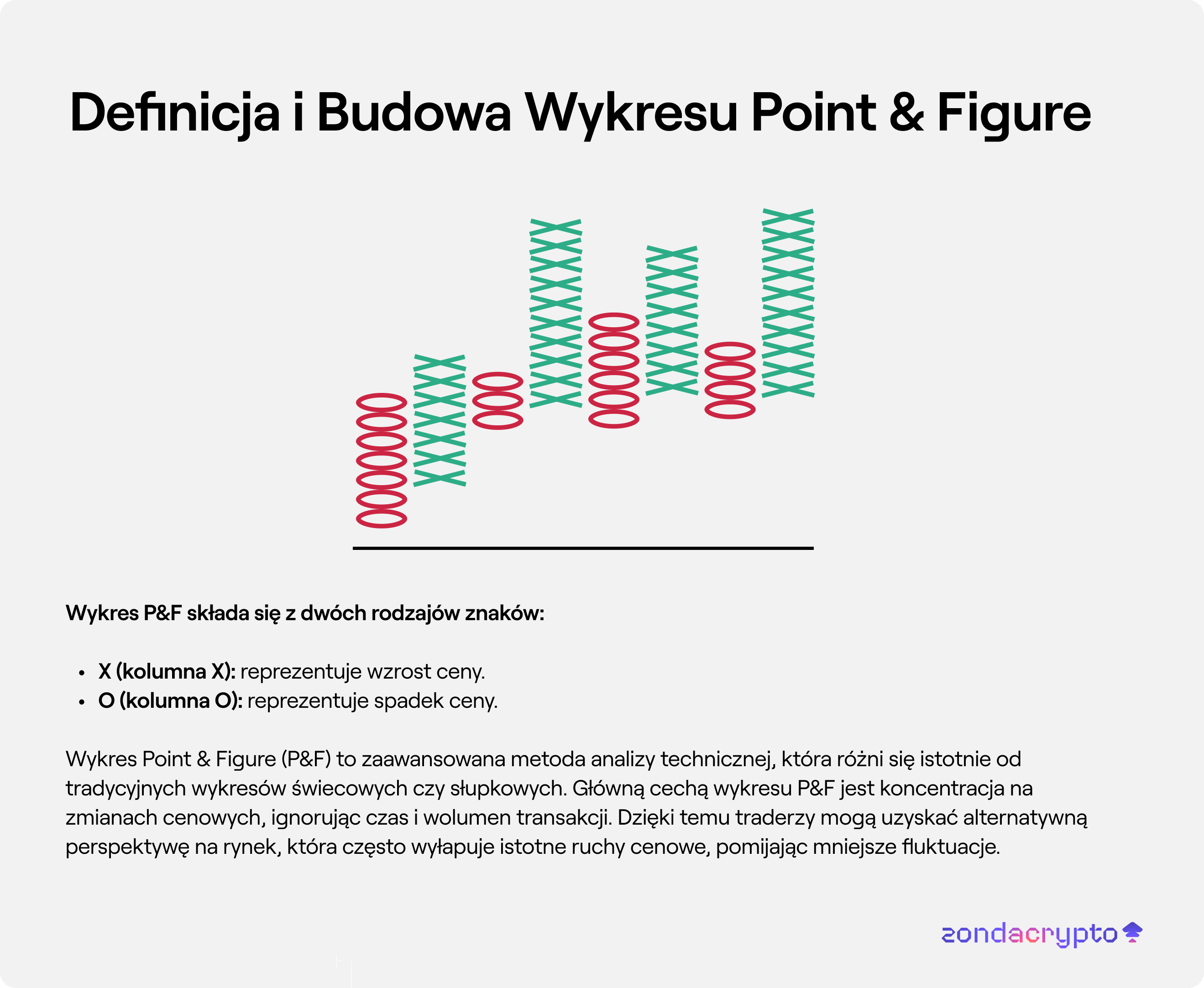 W odróżnieniu od tradycyjnych wykresów, gdzie cena jest przedstawiana w zależności od czasu (zazwyczaj w formie świec lub słupków), na wykresie P&F każda kolumna lub rząd reprezentuje określoną zmianę cenową. Wartość tej zmiany, nazywanej „krokiem” (box size), jest ustalana przez tradera. Na przykład, jeśli trader ustawia box size na 10 USD dla akcji XYZ, to kolumna X zostanie narysowana tylko wtedy, gdy cena wzrośnie o co najmniej 10 USD, a kolumna O pojawi się tylko wtedy, gdy cena spadnie o co najmniej 10 USD.