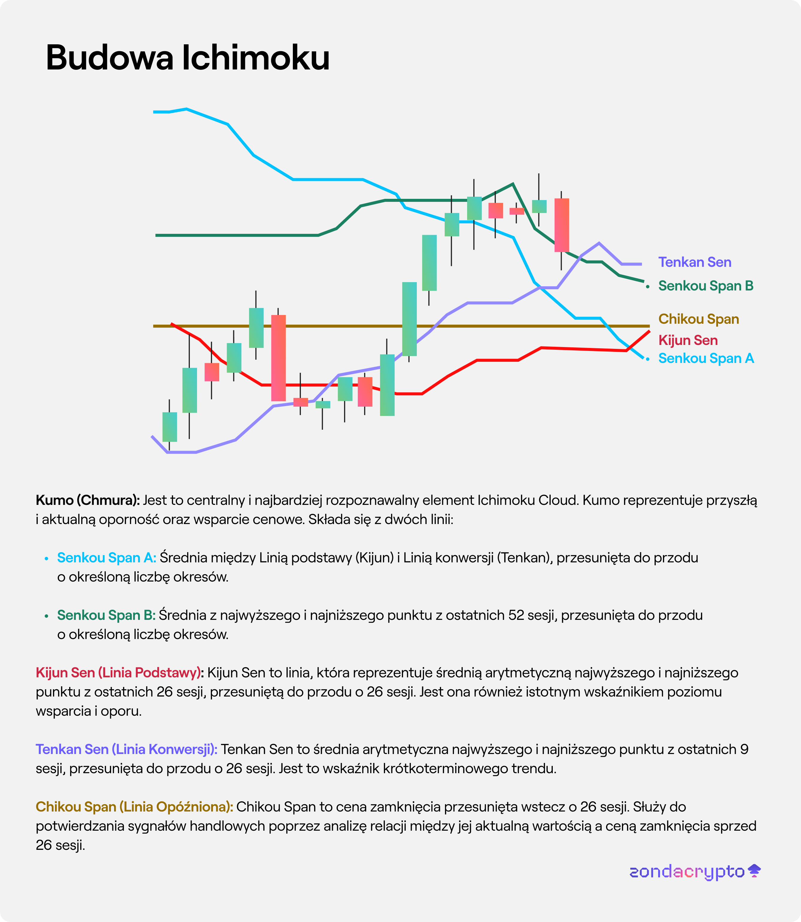 Ichimoku składa się z kilku elementów, które razem tworzą kompleksowy system analizy technicznej: